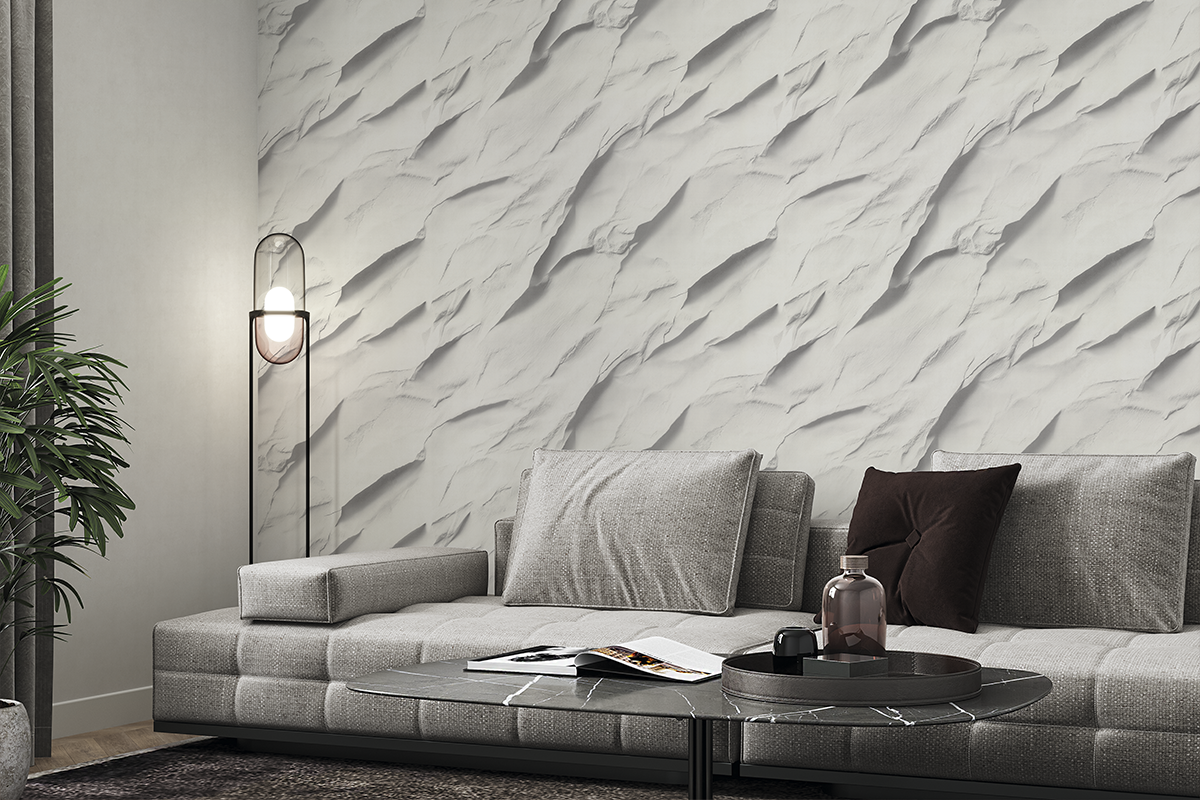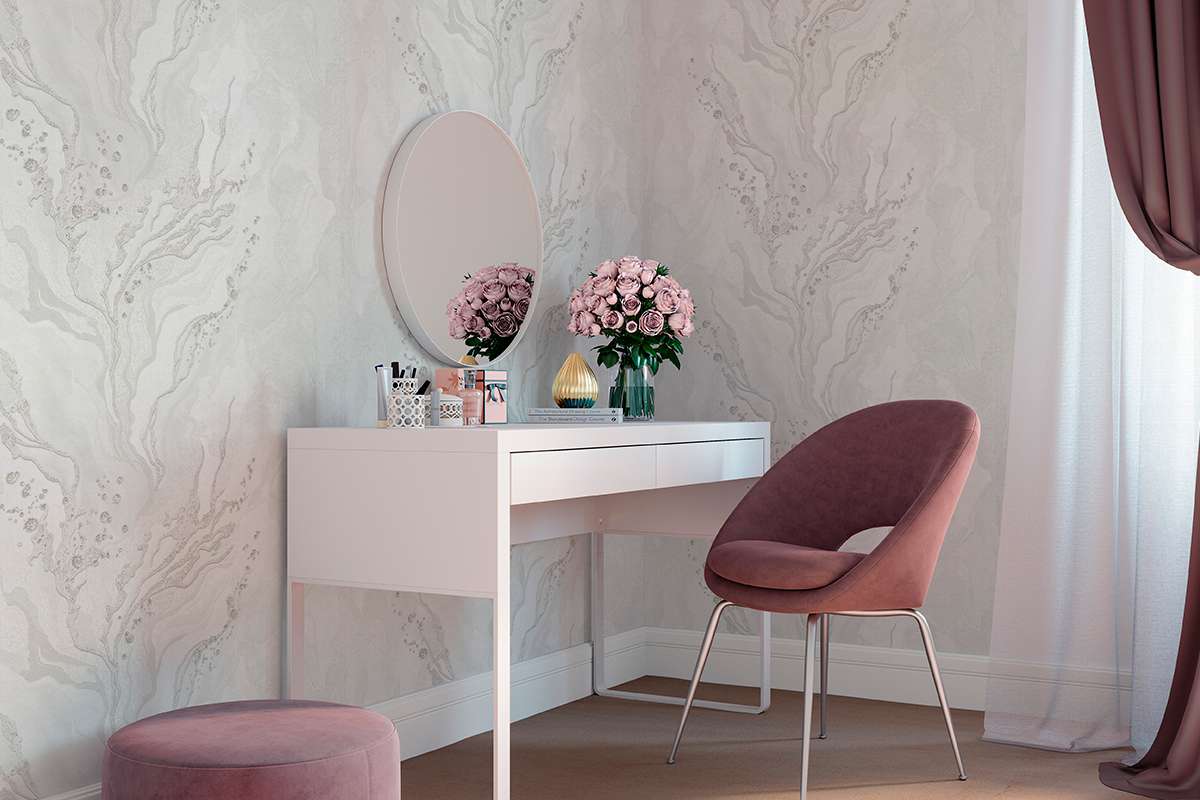 В сочетании с однотонной фактурой под мрамор, текстиль или декоративную штукатурку такие обои дают ровный, чистый фон. На этом фоне мебель и текстиль смотрятся легче, а сама комната кажется более просторной и светлой.