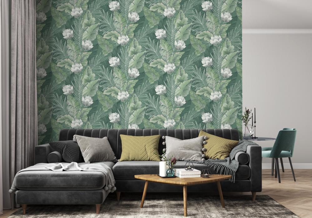 Малахитовый, мятный, горчичный, травяной, фисташковый, изумрудный и другие оттенки зеленого означают обновление и прилив свежей энергии. Они могут иметь различные узоры и рисунки, например, листья деревьев, цветы, ветки. Такие обои используются в разных комнатах – от спальни до кабинета или гостиной.